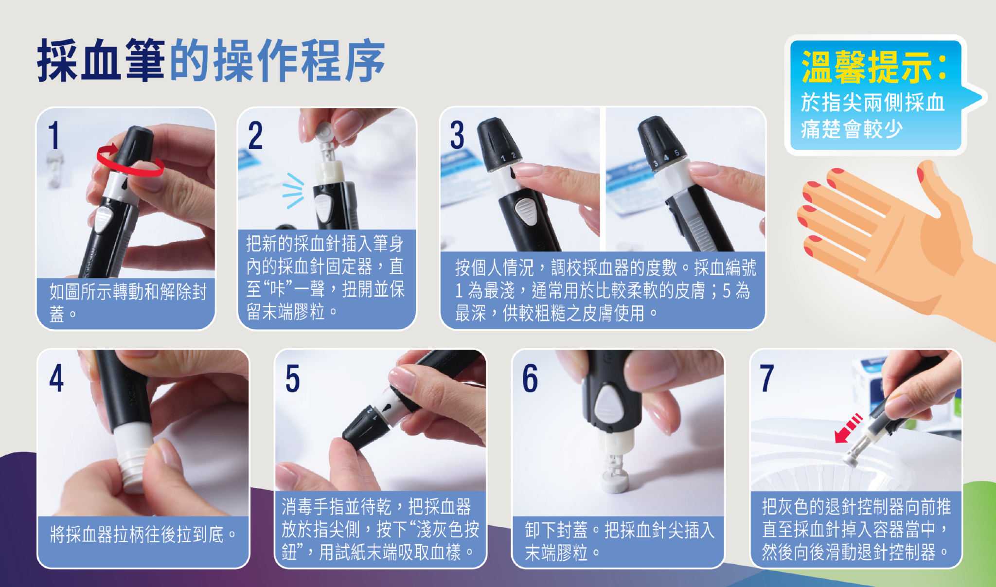 - 以採血筆淺刺採血,僅須一小滴血樣,幾乎無痛