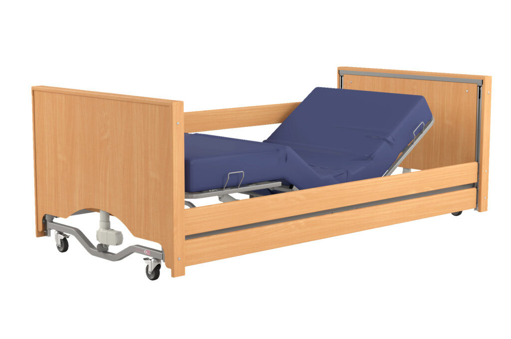 Taurus 2 LOW LUX model we used the best features of Taurus beds’ series and guidelines from the users to introduce a number of changes affecting comfort and functionality of the bed. The main difference is four-column construction. This solution guarantees greater stability of the bed. For comfort of use position of the siderails has been lowered significantly to facilitate getting up and sitting on the bed. Introduced changes allowed us to reduce the total length of the bed – making it more compact and suitable for use in rooms with limited space. In Taurus 2 LOW LUX we used decorative wooden bed ends. To ensure patients safety and comfort Taurus 2 Low offers extremely low position of mattress platform.