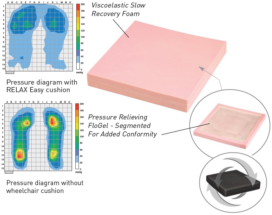 - The combination of pressure relieving FloGel and viscoelastic foam facilitates effective pressure re-distribution while allowing the patient to immerse themselves comfortably into the cushion
