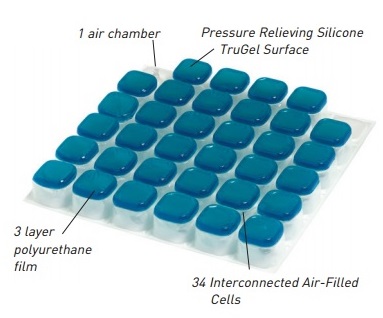 - 34 interconnected air-filled cells allow movement of air across surface of cushion, each covered with a layer of pressure relieving silicone-based TruGel